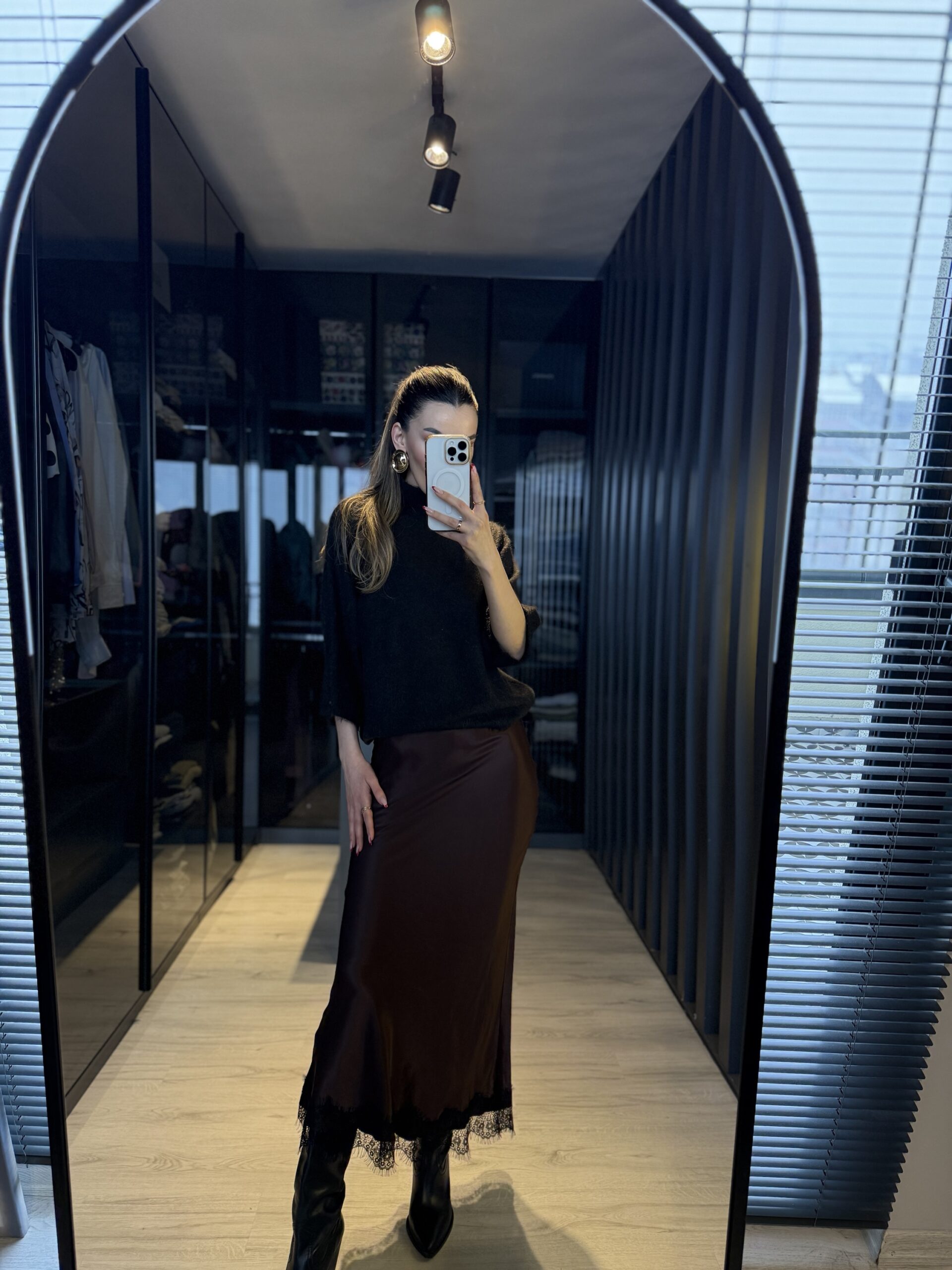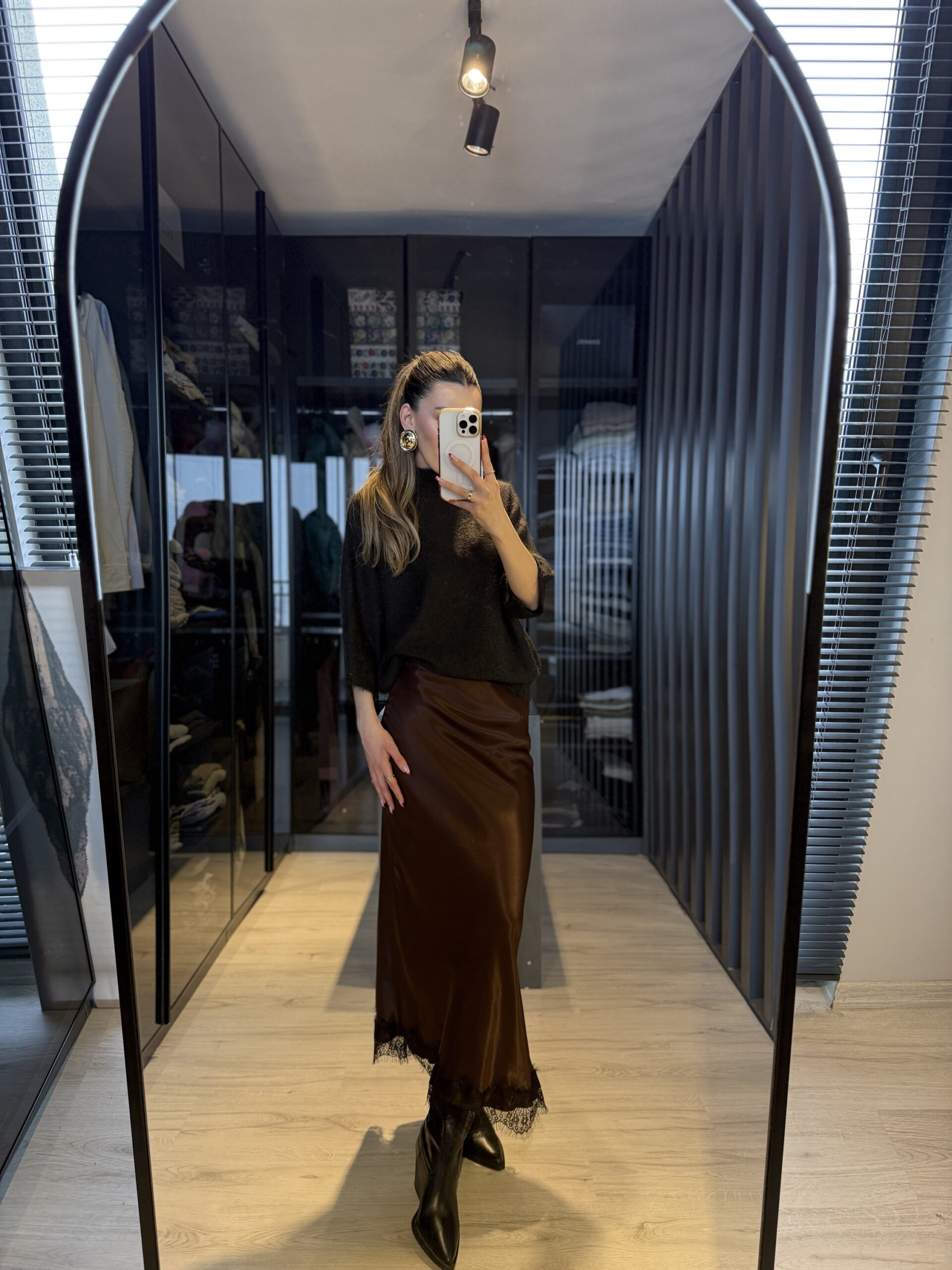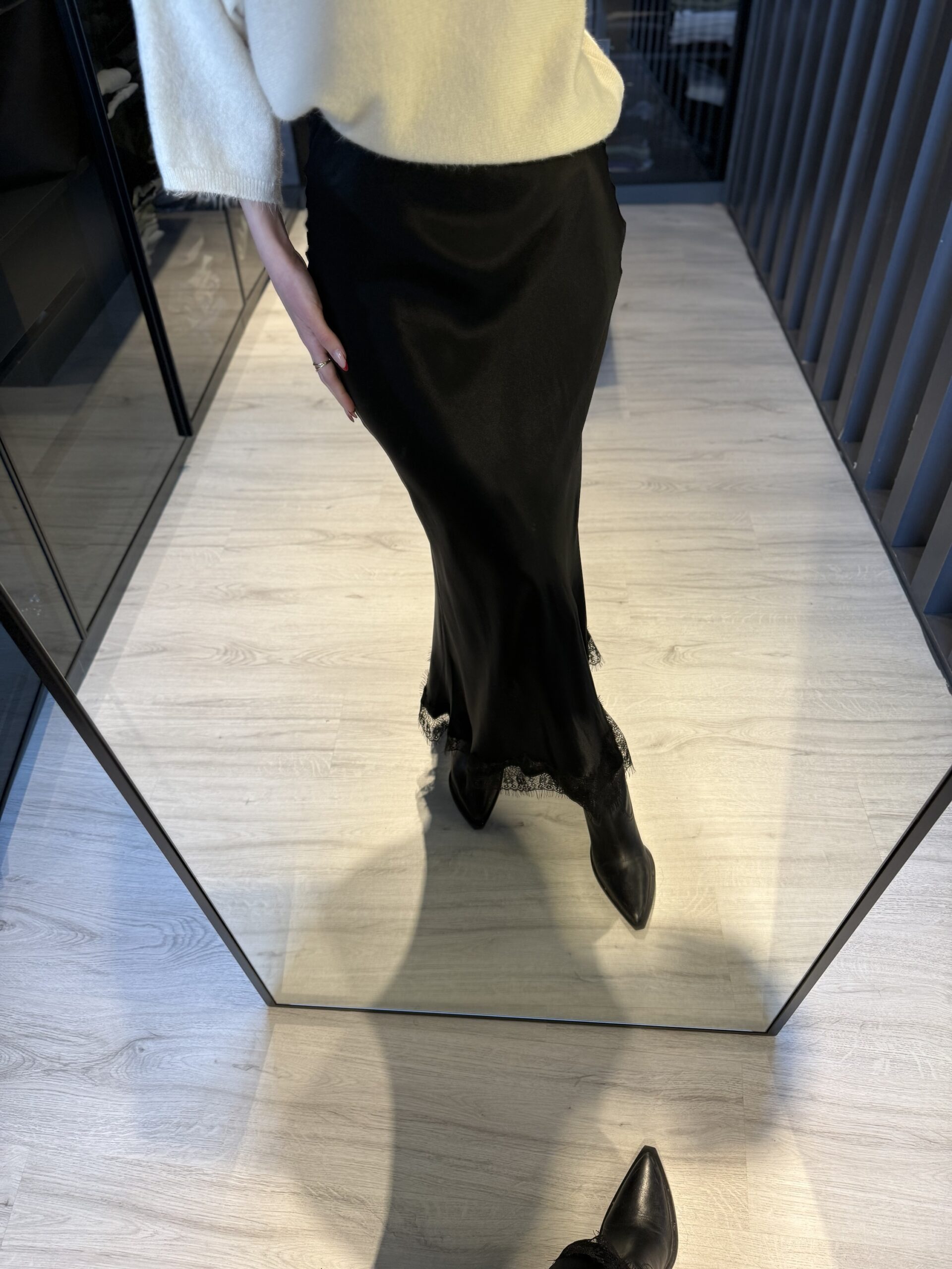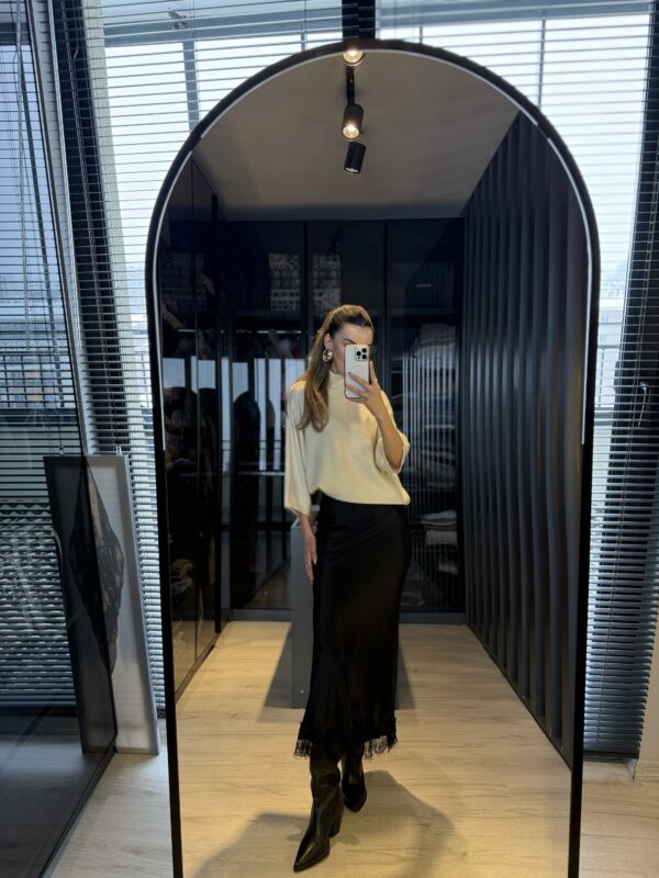 Dantel detay saten midi etek